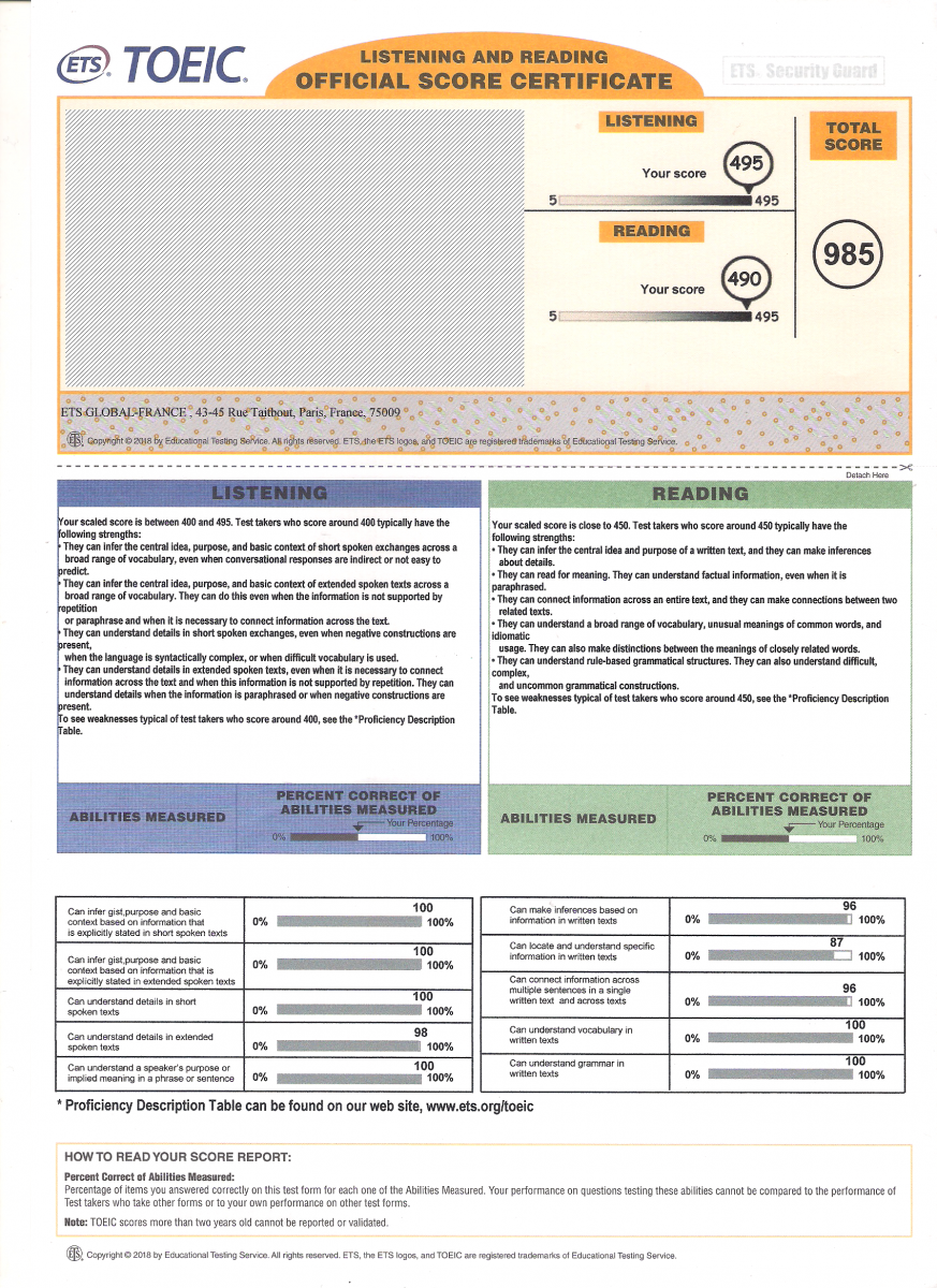 Toute l'équipe Cap'TOEIC félicite cet élève pour son score de 890 au TOEIC !