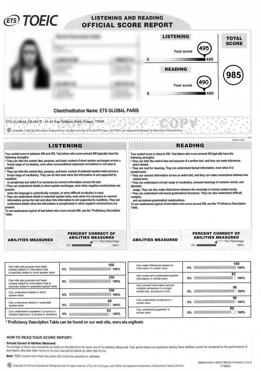 Félicitations à Madame ATLAN pour son score de 970 points au TOEIC !